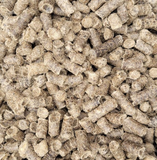 Wollpellets aus Gemisch von Alpakafaser (unsere Tiere) und Schafwolle. Das Lanolin der Schafwolle dient als Kleber.